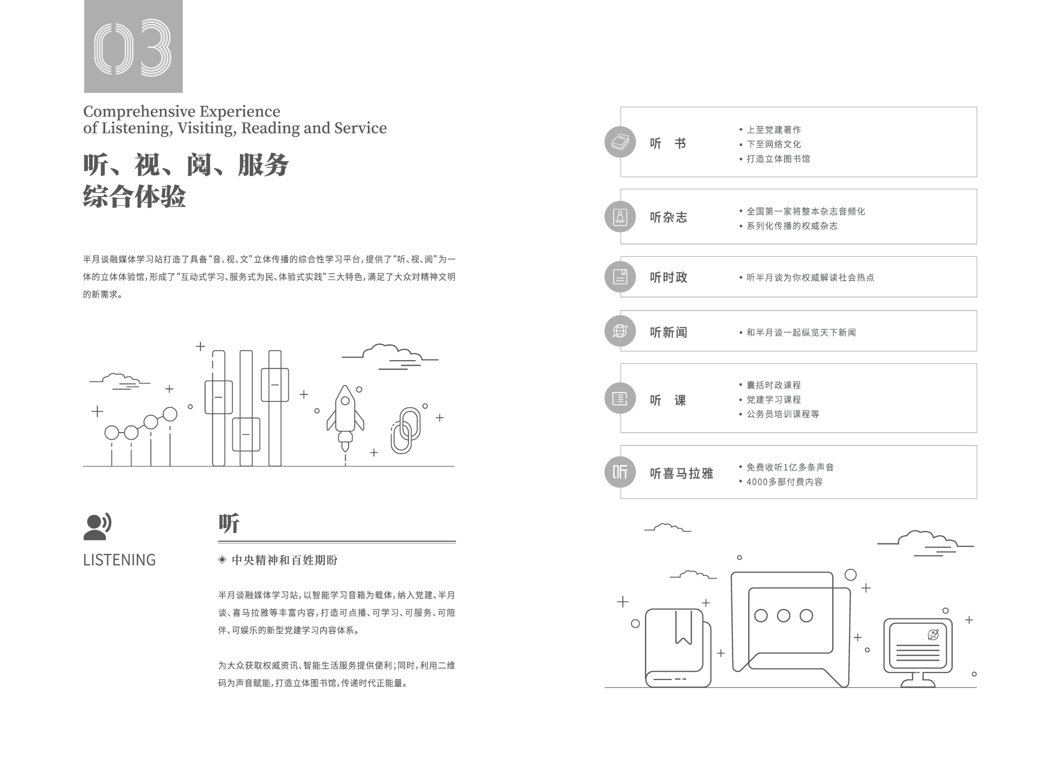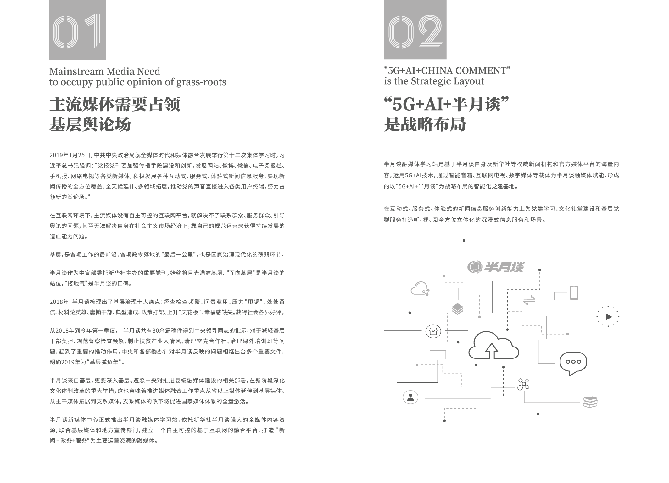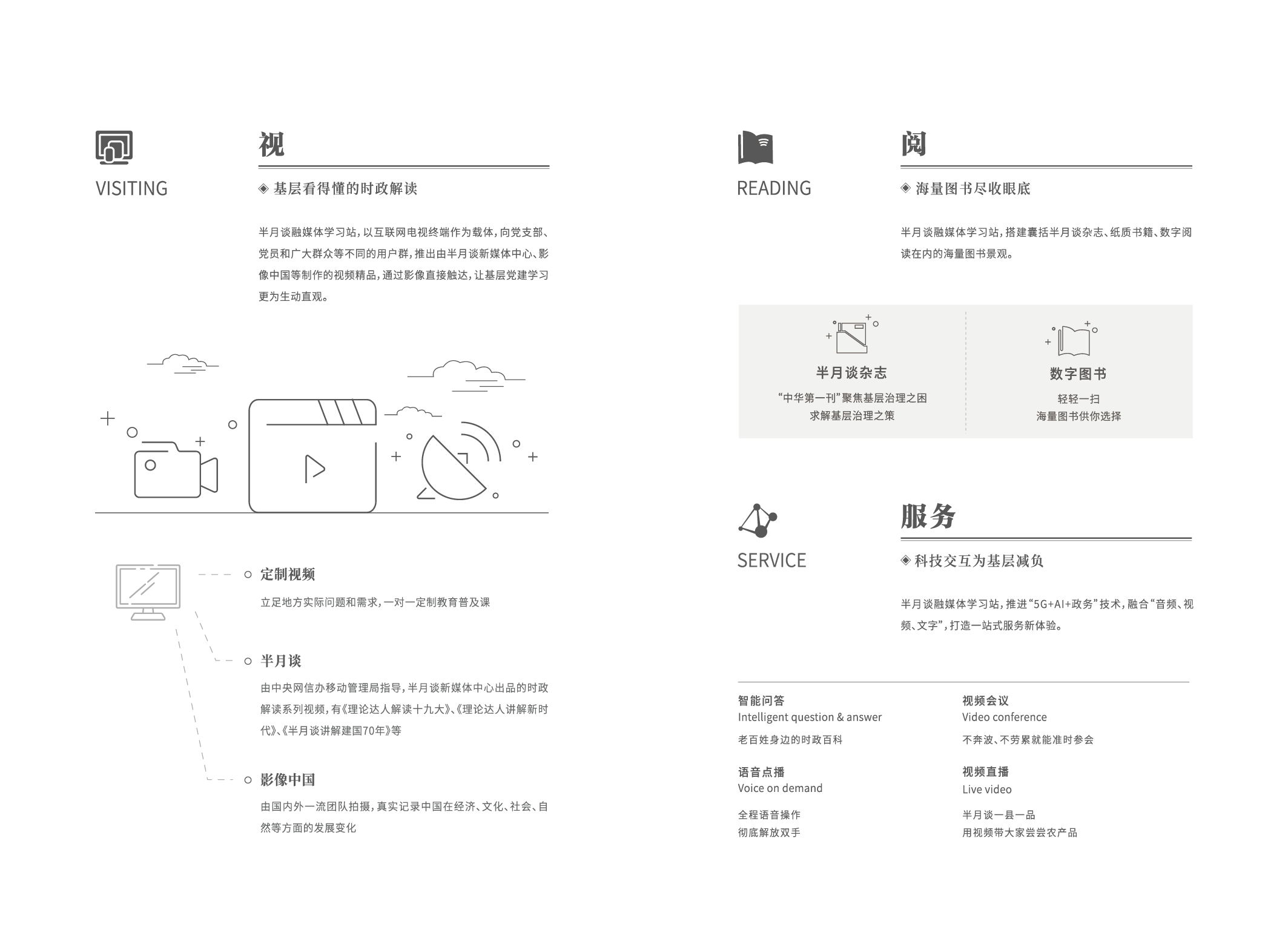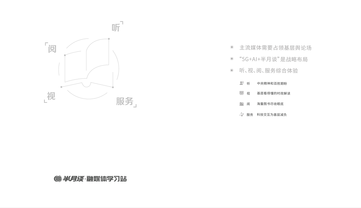 【半月谈融媒体学习站】基于半月谈和新华社等权威党媒及官方媒体的海量内容和资源,融合AI+5G+党媒,通过AI智能音箱、数字融合媒体、互联网电视等载体,在互动式、服务式、体验式的新闻信息服务创新能力上为基层党员学习、基层人民群众文化服务和基层干部政务为民的能力建设上打造全方位智能化的综合服务平台。